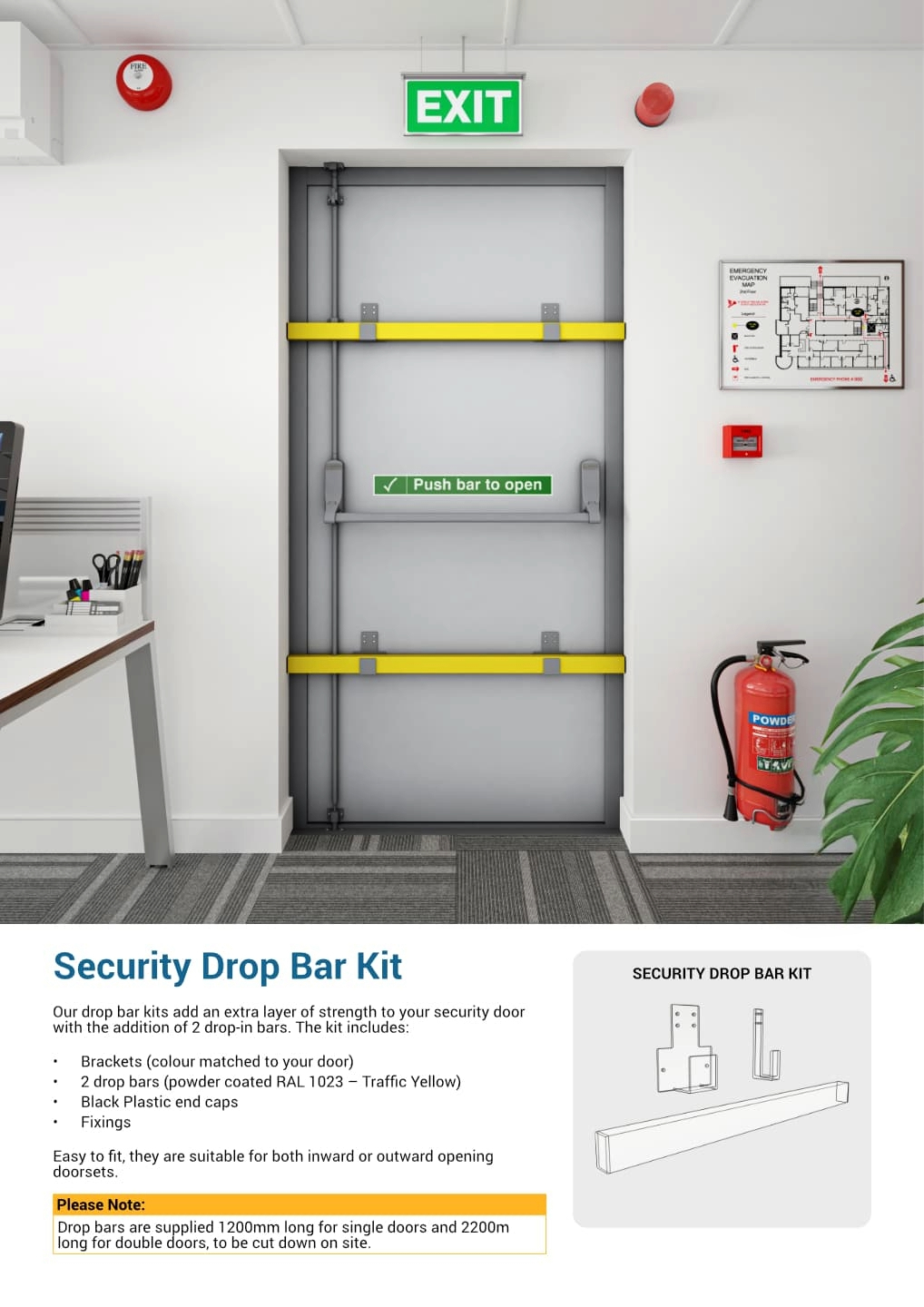 Our data sheet for the Security Drop Bar Kit for Fire Exit Doors.