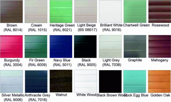White, Brown, Cream, Heritage Green, Fir Green, Navy Blue, Black, Burgandy, Light Grey, Silver, Anthracite Grey
