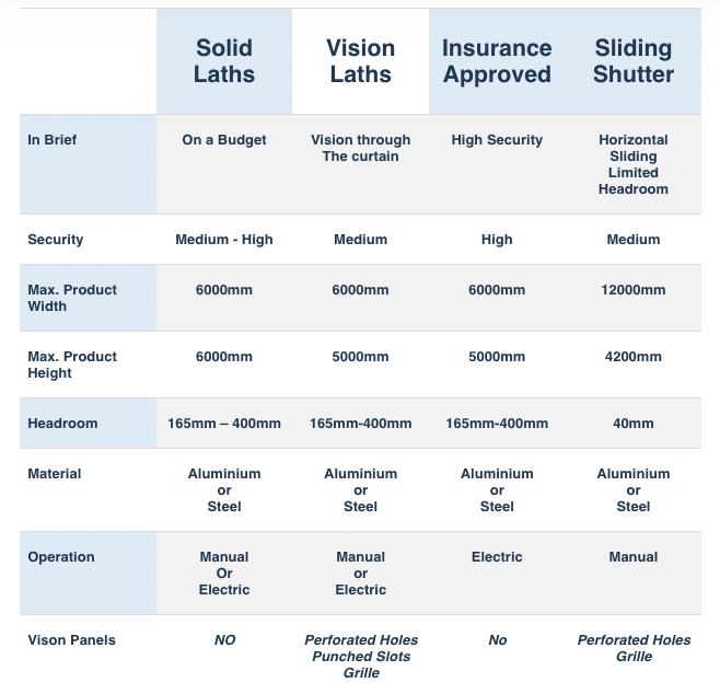 This is a comparison of the different types of Retail Shutters, which includes Solid, Vision, Insurance Approved and Sliding Shutters.