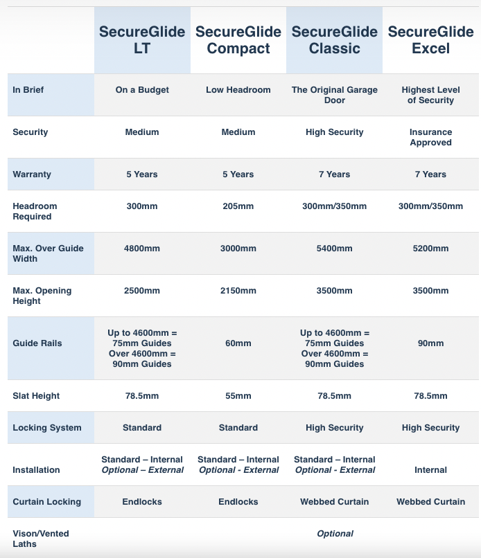 This page shows the different types of Roller Garage available and what the differences are between the models.
