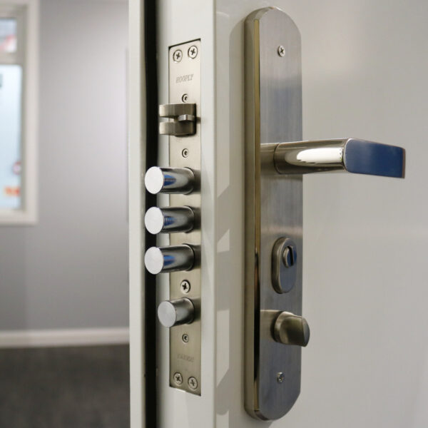 • Standard Sized Steel Door and Frame with Multi Point Locking System, Stainless Handles, Stainless Steel Hinges and DDA Threshold.