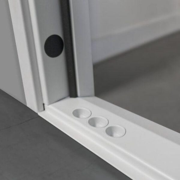 50mm door leaf thickness, fitted with an integrated astragal for added security. Comprising of 2 x 1mm galvanised fully welded steel sheets.  Mineral wool core providing an 2.20 U Value and a 35dB Acoustic Rating.